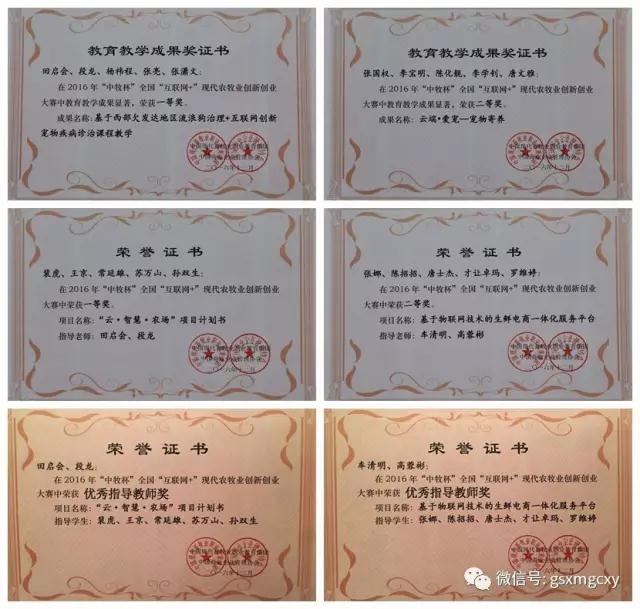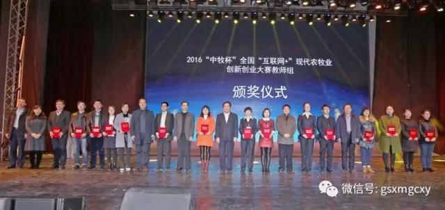 本次大赛经院校选拔,集团初赛,评委评审和现场PPT演示、答辩等环节,分别评选出教师组、学生组一等奖5项,二等奖10项,三等奖15项。我院兽医系田启会、段龙、杨祎程、张亮、张潇文老师的《基于西部欠发达地区流浪狗治理+互联网创新宠物疾病诊治课程教学》项目获2016年“中牧杯”全国“互联网+”现代农牧业教育教学成果一等奖,张国权、李宝明、陈化靓、李学钊、唐文雅老师的《云端·爱宠---宠物寄养》项目获二等奖;裴虎、王京、常延雄、苏万山、孙双生同学的《“云·智慧·农场”项目计划书》项目获2016年“中牧杯”全国“互联网+”现代农牧业创新创业大赛一等奖,张娜、陈招招、唐士杰、才让卓玛、罗维婷同学的《基于物联网技术的生鲜电商一体化服务平台》项目获二等奖,李芸、张伟军、杨东礼、陈玉香、卢灏同学的《“互联网﹠草编”项目计划书》项目获三等奖;田启会、段龙、车清明、高蓉彬老师分别获2016年“中牧杯”全国“互联网+”现代农牧业创新创业大赛“优秀指导教师”。