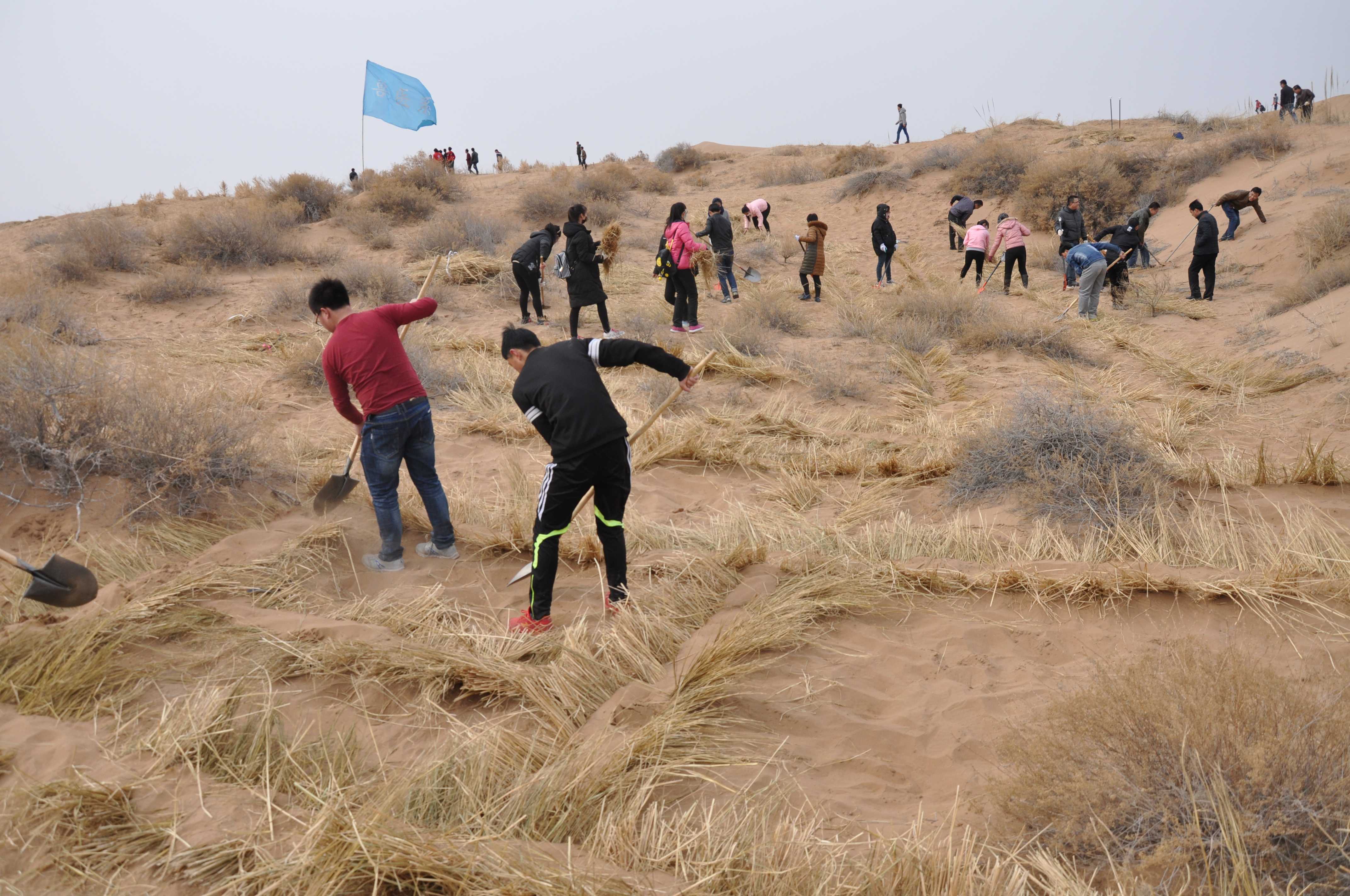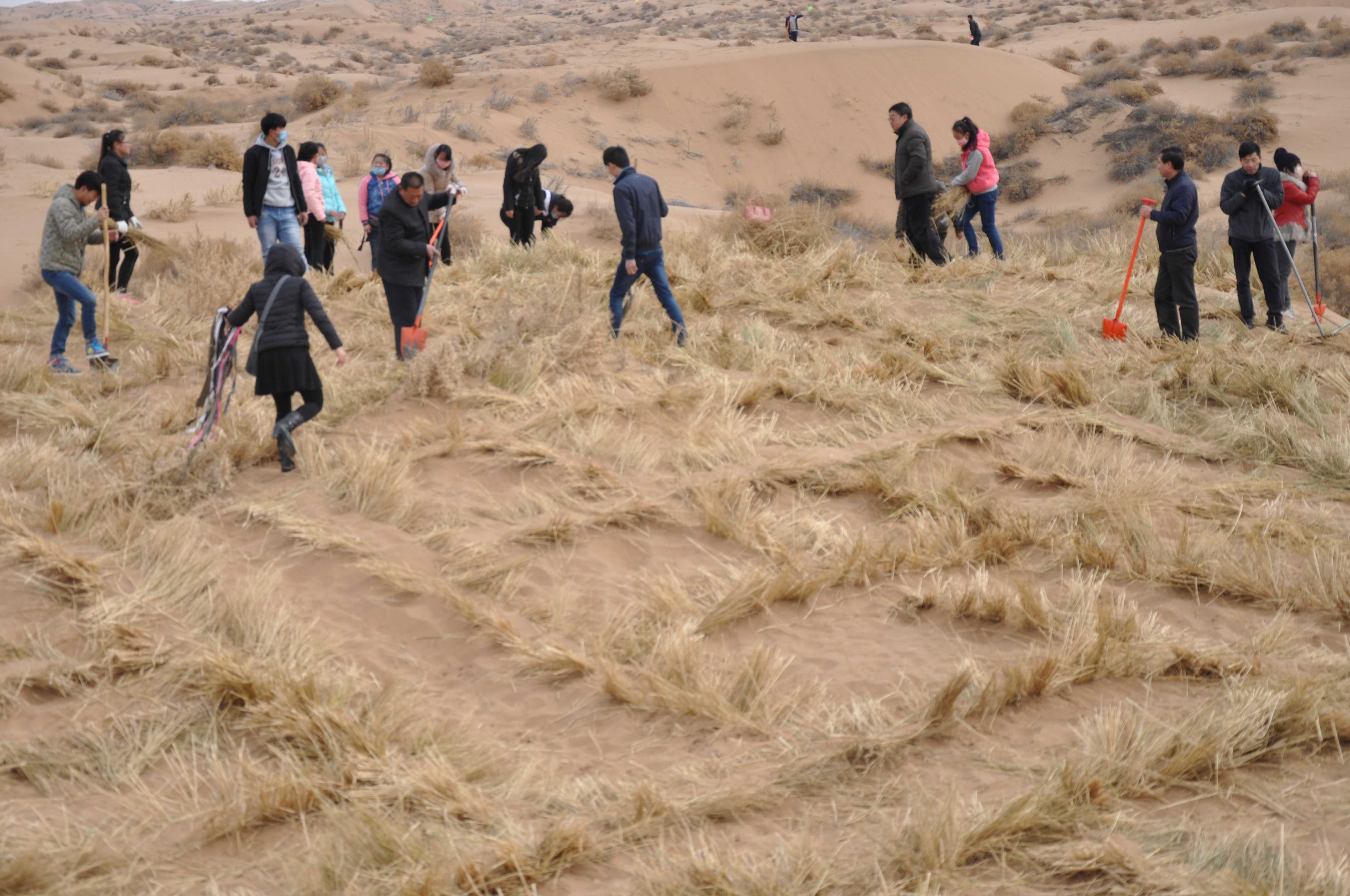 到达目的地后,基地技术人员首先对志愿者们进行了简单的治沙培训,强调了注意事项,以确保治沙效果。随后,志愿者们便迅速投入到紧张有序的治沙活动中。他们分为五组,团结协作、密切配合, 采用“草方格固沙法”,利用麦草、芦苇、稻草等材料在沙漠中制成方格,先对流动沙丘进行固沙。